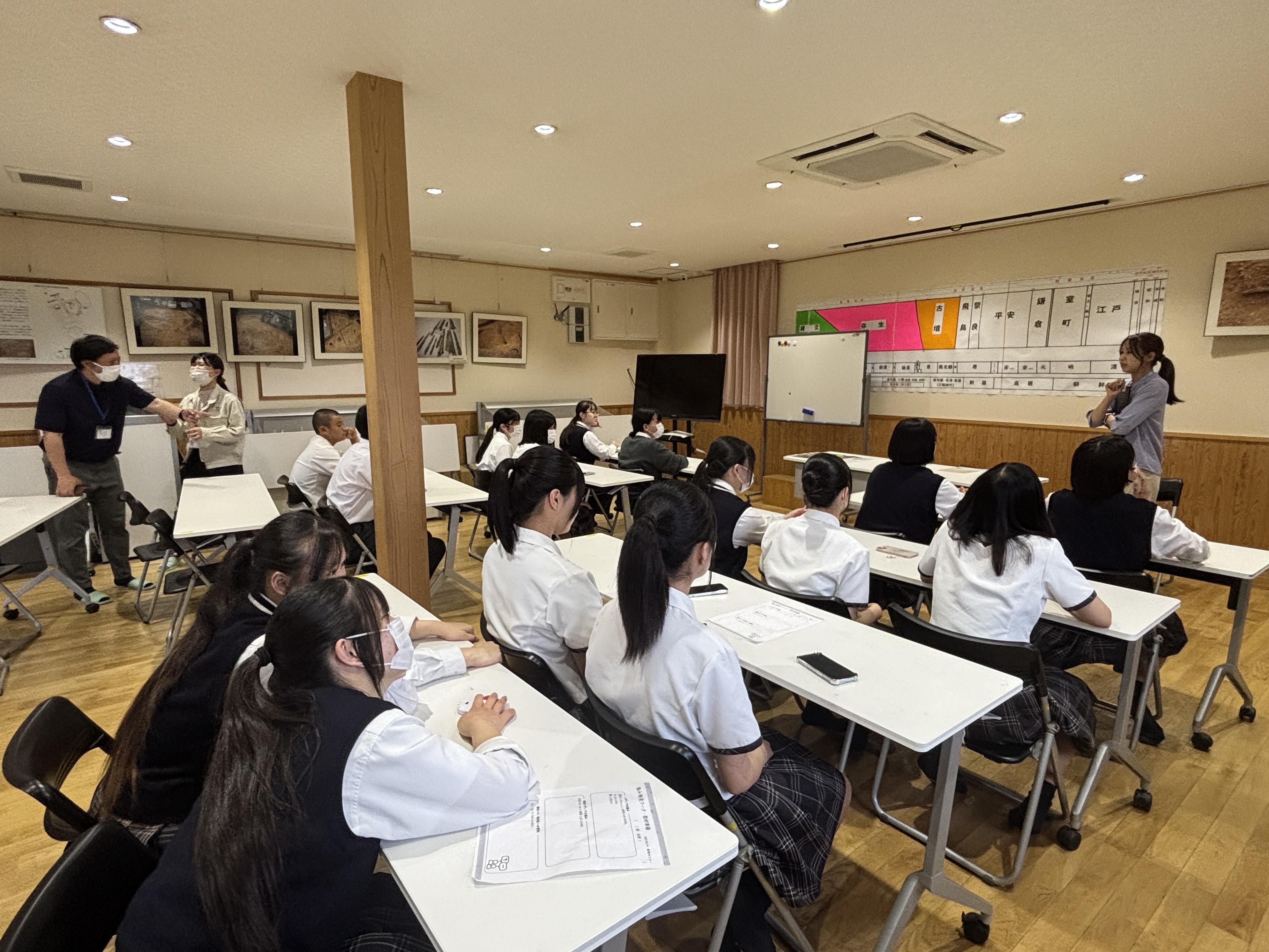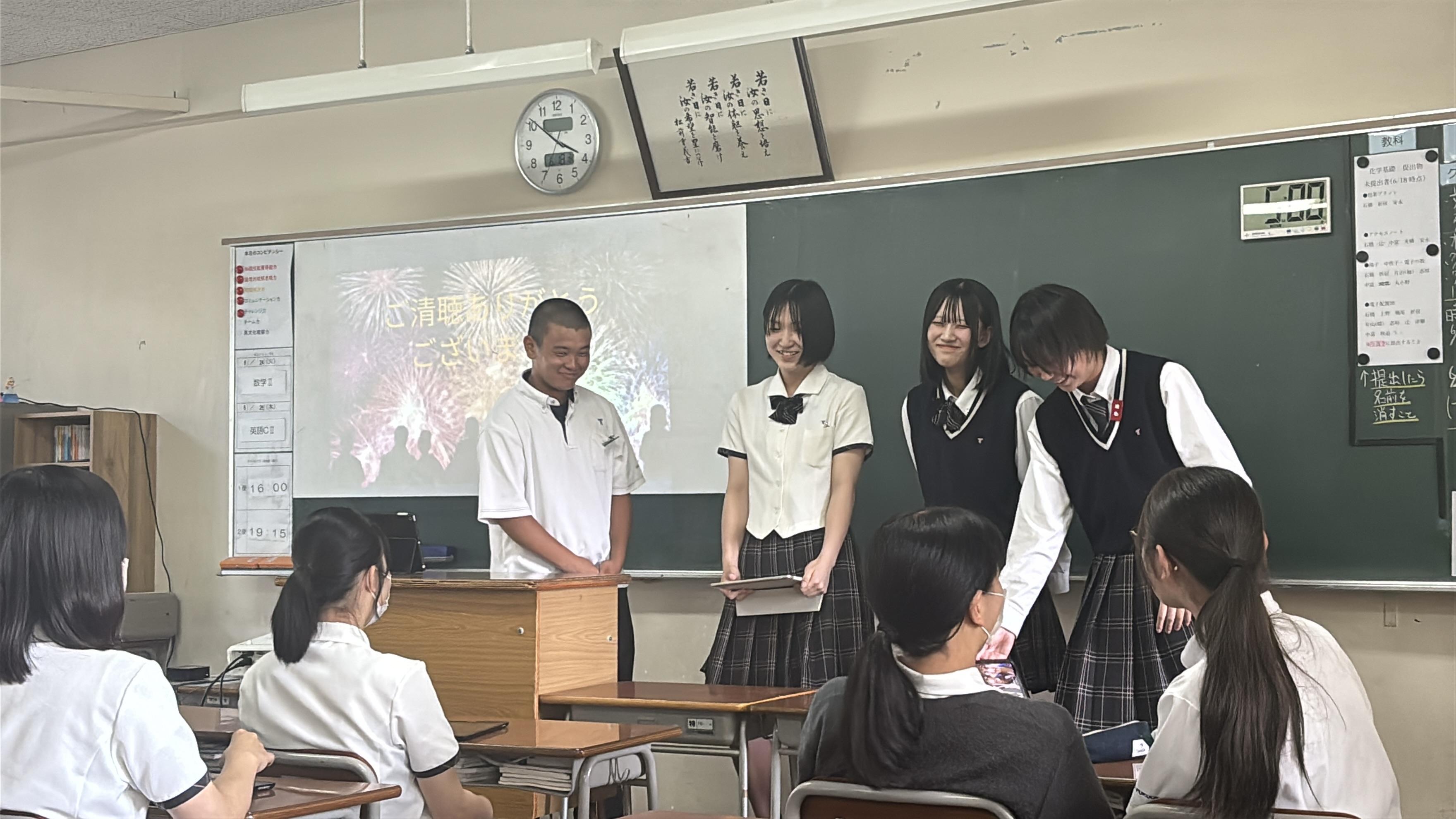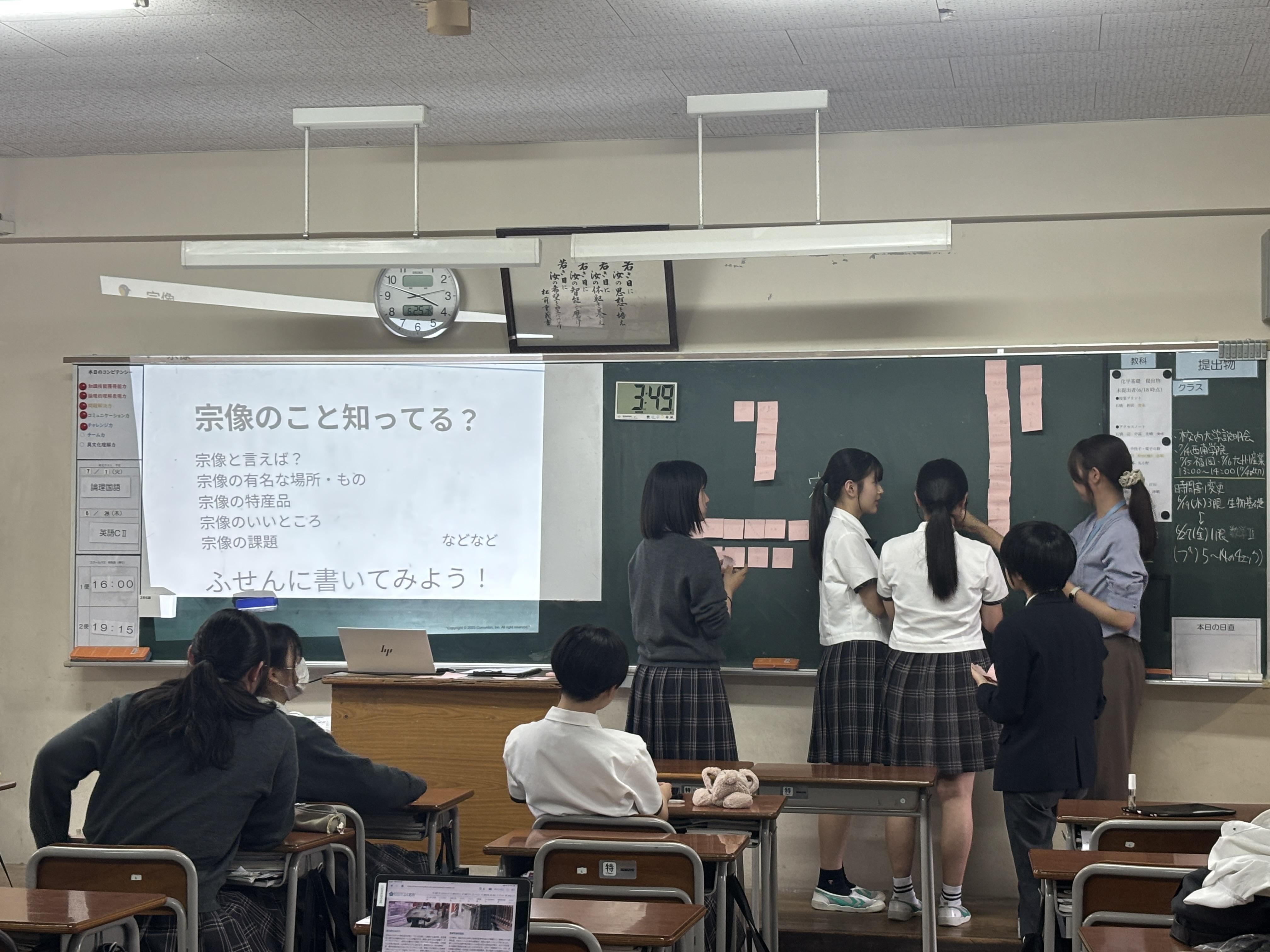 1時間目はオリエンテーションを行いました。参加するのは、このセミナーを選択した1・2年生の生徒17名です。2時間目は、宗像経済新聞編集長の中村さんから、会社の概要などを説明していただきました。
